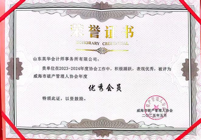 近日,山东英华会计师事务所有限公司因在2023-2024年度协会工作中,积极踊跃,表现优秀,被威海破产人管理协会评为“优秀会员”,并颁发荣誉证书,以资奖励。
